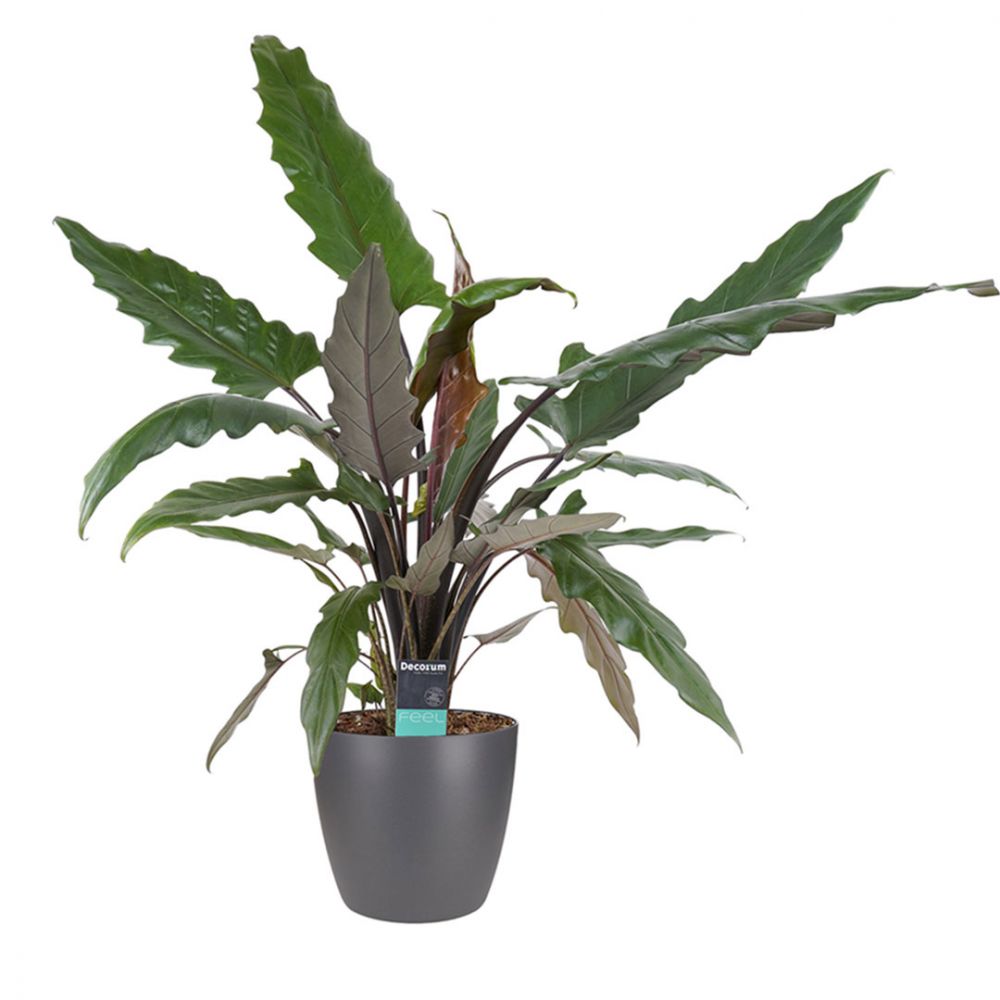 The striking green shiny leaves of the Alocasia fit perfectly into any stylish interior.