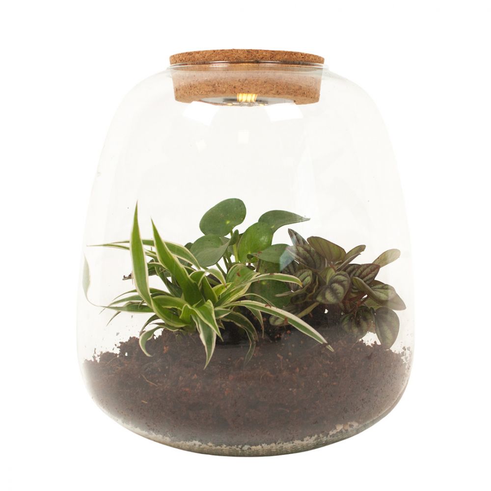 This terrarium has a light. This allows you to always enjoy the terrarium.